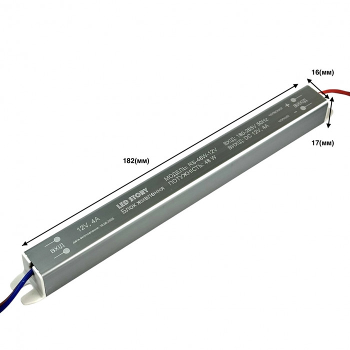 Блок живлення 12В 48Вт 4А ультратонкий (негерметичний, металевий корпус, IP20). Ультратонкий блок живлення призначений для підключення світлодіодних стрічок та іншого 12-вольтового обладнання в умовах сухих приміщень. Завдяки потужності 48 Вт і силі струму до 4А, він впевнено забезпечує роботу середніх за довжиною LED-ліній або кількох зон підсвічування одночасно. Модель виконана в міцному металевому корпусі, який не тільки захищає електроніку, а й ефективно відводить тепло, що подовжує термін служби пристрою. Завдяки своїм габаритам, блок ідеально підходить для прихованого монтажу в профілях, нішах, меблях та інших обмежених просторах.