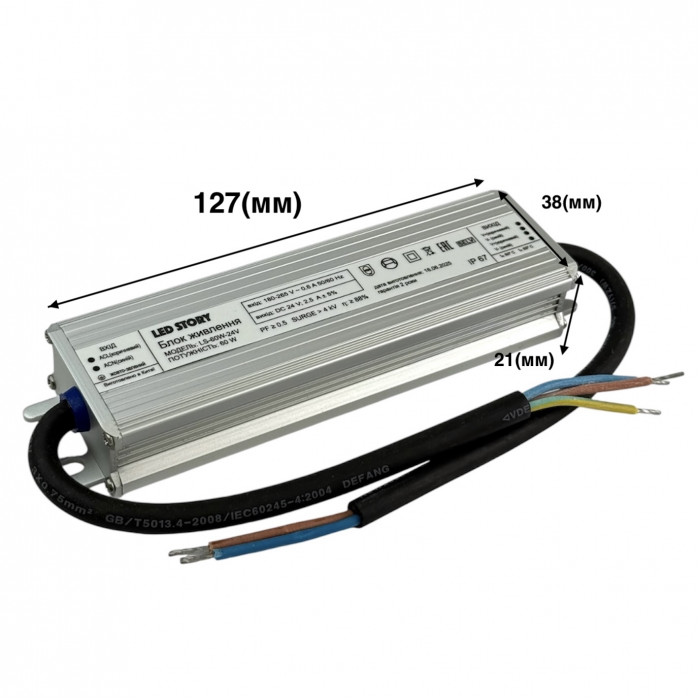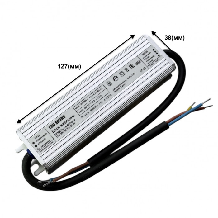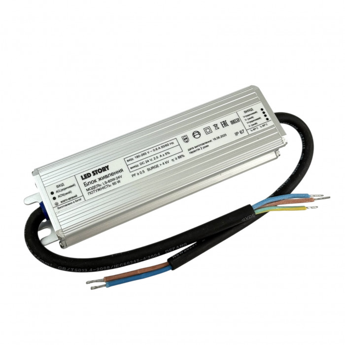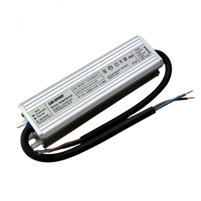 Виконаний у герметичному металевому корпусі блок живлення для світлодіодних стрічок із робочою напругою 24 Вольти. БЖ має потужність 60Вт, а також клас вологозахисту IP67. Це дозволяє безпечно використовувати його на вулиці впродовж усього року, без необхідності додаткового захисту від пилу чи вологи.