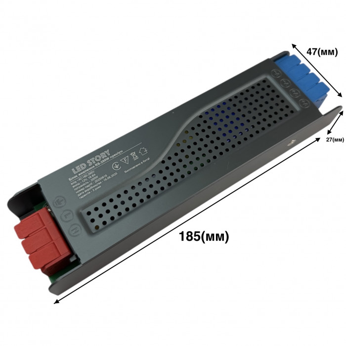 Пристрій призначений для внутрішнього використання — корпус із міцного металу має клас захисту IP20, що забезпечує надійний захист від пилу, але вимагає монтажу в сухих, захищених від вологи приміщеннях. Завдяки компактним розмірам та продуманій конструкції блок живлення легко інтегрується в будь-яку систему освітлення.