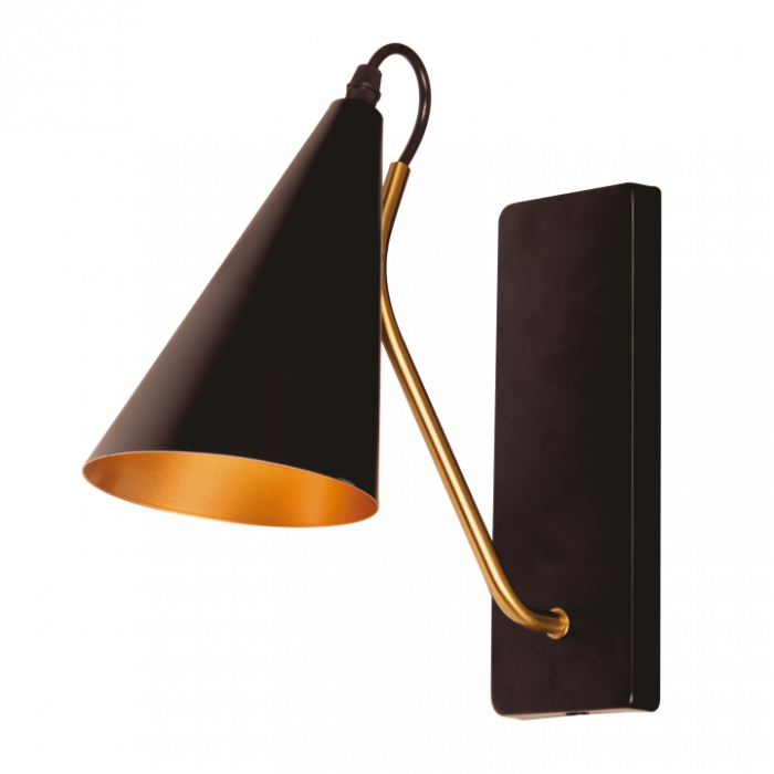 Лаконічний, але виразний — цей настінний світильник створений для тих, хто цінує графічну чіткість і глибину кольору. Чорний конічний плафон із внутрішнім золотим покриттям формує концентроване світло, яке не розсіюється, а підкреслює текстури й об’єкти в інтер’єрі. Ідеальний вибір для акцентного освітлення — над консоллю, біля дзеркала або в арт-просторі.
