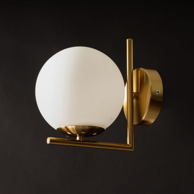 Це настінне бра — компактне світлове рішення з характером. Його геометрія проста, але виразна: скляний плафон у формі кулі м’яко світиться, а металевий каркас золотого кольору додає тепла й елегантності. Такий дизайн легко інтегрується в сучасний інтер’єр, не порушуючи його ритму.