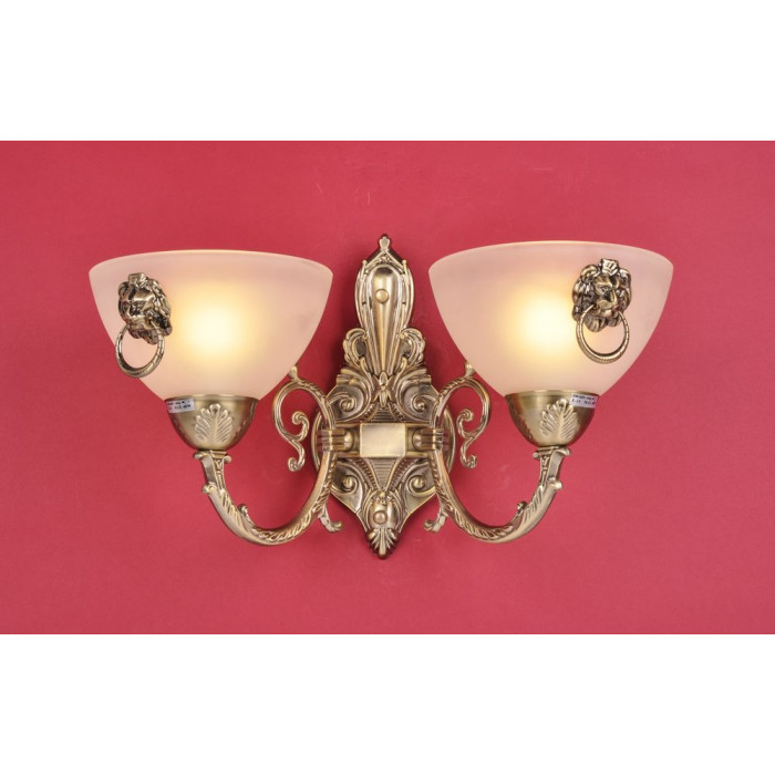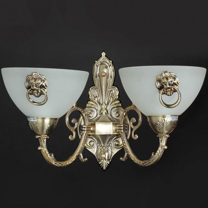 Це бра — справжній витвір декоративного мистецтва, що поєднує функціональність із естетикою старовинного інтер’єру. Металевий каркас у бронзовому відтінку прикрашений витонченими завитками та рельєфними деталями, а головним акцентом стають декоративні левові голови з кільцями — символ сили, благородства та стилю. Матове скло білого кольору м’яко розсіює світло, створюючи атмосферу тепла й затишку.