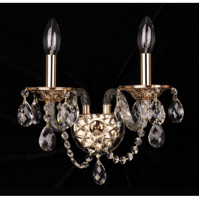Класичне настінне бра з двома джерелами світла — це елегантне та вишукане рішення для інтер’єрів, у яких важлива не лише функціональність, а й декоративний акцент. Витончений металевий каркас у золотому кольорі, оздоблений вигнутими елементами, гармонійно поєднується з прозорими акриловими підвісами, які імітують кришталь. Таке поєднання створює в інтер'єрі атмосферу тепла, затишку й благородного сяйва.