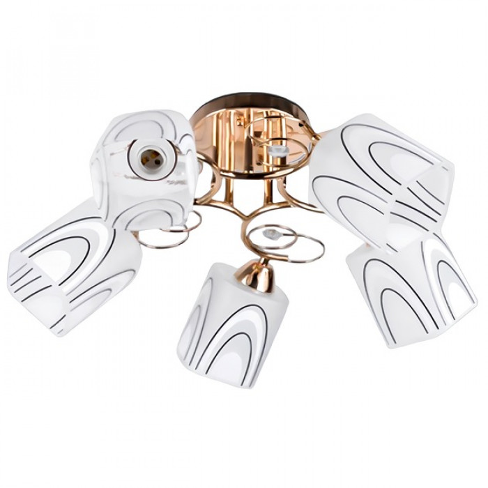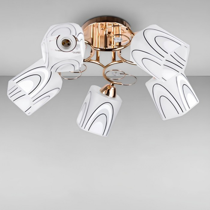 Ця стельова люстра — справжній декоративний акцент для сучасного інтер’єру. Золотий металевий каркас із плавними лініями та кристалічними деталями додає простору тепла й елегантності, а п’ять скляних плафонів із графічним орнаментом забезпечують рівномірне, м’яке освітлення без різких тіней.