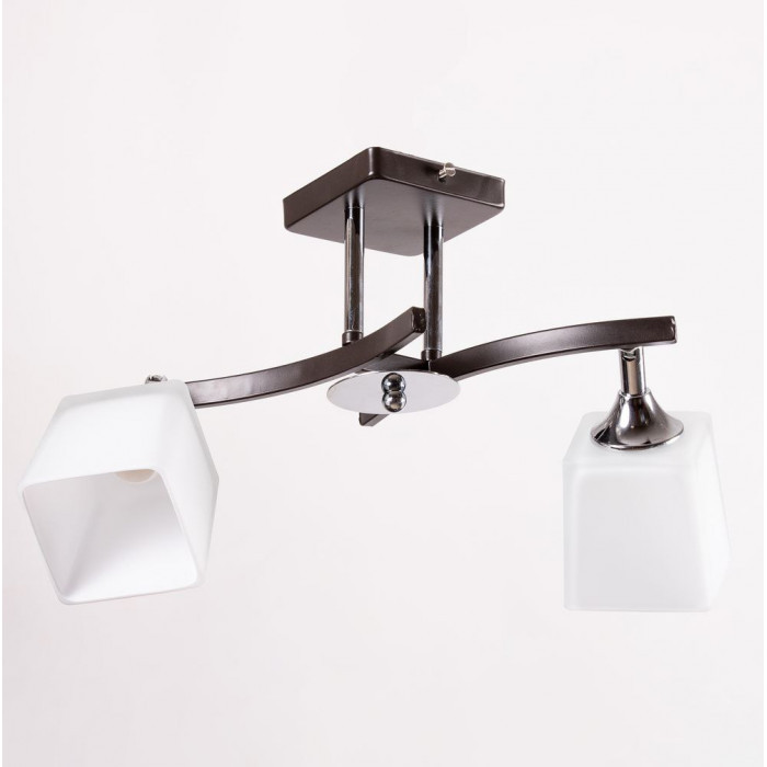 Сучасна стельова люстра на два плафони — стильне рішення для освітлення житлових і комерційних приміщень. Чорний металевий каркас із хромованими акцентами поєднується зі скляними плафонами геометричної форми, створюючи лаконічний і елегантний образ. Завдяки патрону E27, світильник підтримує світлодіодні лампи будь-якої потужності або лампи розжарювання до 60W. Габарити: ширина — 46 см, висота — 25 см. Кріплення до стелі здійснюється на планку, що забезпечує надійність і простоту монтажу. Ідеально підходить для інтер’єрів у стилі модерн, мінімалізм або хай-тек.