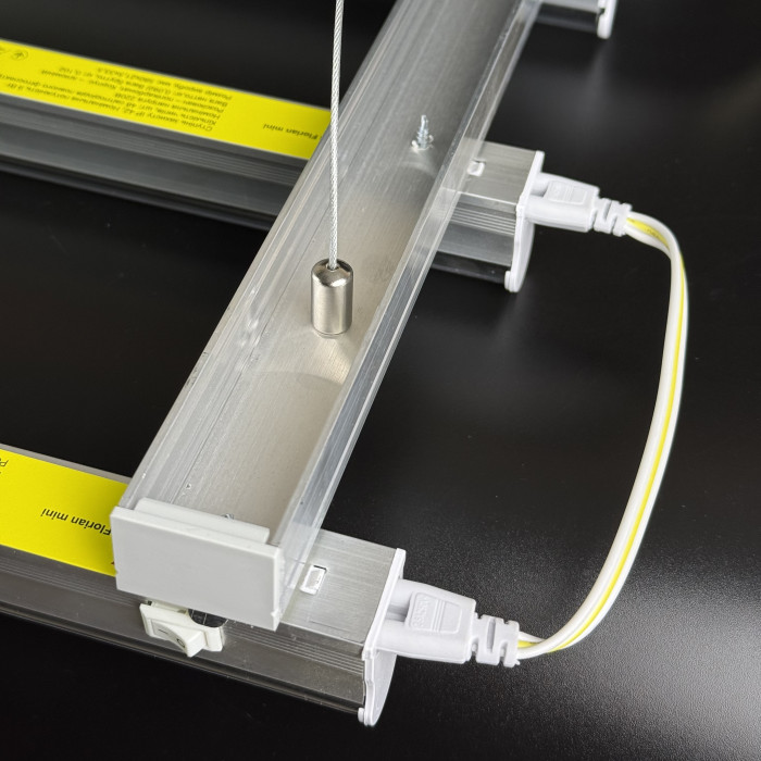 Алюмінієвий корпус кожного модуля ефективно відводить тепло, забезпечуючи стабільну роботу та тривалий ресурс. Прозорий PC-розсіювач рівномірно розподіляє світло, не створюючи різких тіней. Світильник підходить для підвісного, стельового, накладного або настінного монтажу, що дозволяє легко інтегрувати його у будь-який гроубокс чи стелаж.