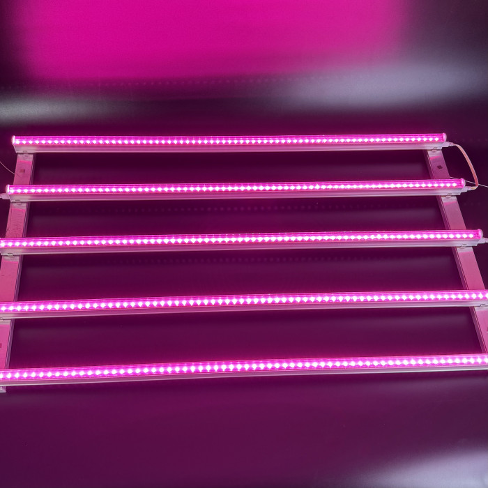 Фітосвітильник виконаний у вигляді рамної конструкції з п’ятьма лінійними LED-модулями, що забезпечує рівномірне та потужне освітлення всієї площі гроубоксу. Подібне компонування, як у професійних гроу-світильниках, дозволяє світлу рівномірно розподілятися без «провалів» по краях і перегріву в центрі.