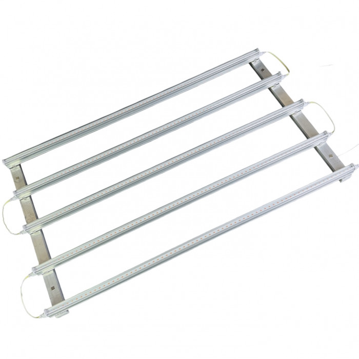 Конструкція складається з 5 незалежних лінійних світильників, з’єднаних послідовно. На кожному модулі передбачена окрема кнопка вмикання/вимикання, що дозволяє гнучко керувати потужністю освітлення — за потреби можна вимкнути один або кілька світильників без відключення всієї системи. Це особливо зручно при різних фазах росту рослин або зміні заповнення гроубоксу.