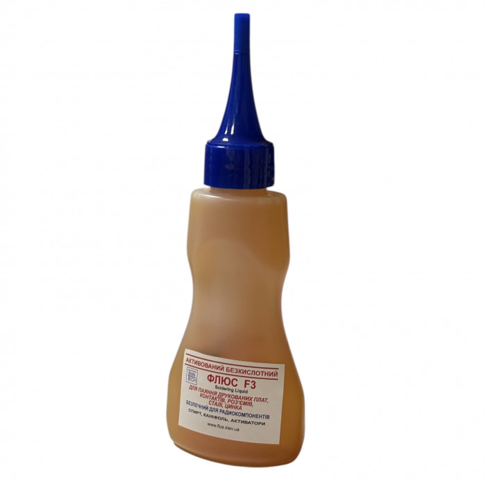 Флюс F3 є активованим безкислотним флюсом, призначеним для паяння різноманітних компонентів, зокрема печатних плат, контактів, роз'ємів, а також матеріалів із сталі та цинку. Завдяки своїй універсальності і широкому застосуванню, він став найбільш популярним в серії F* флюсів.