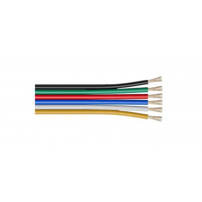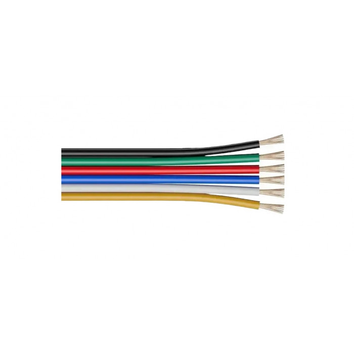 Кабель 6P 6×0,2 мм² для RGB+CCT LED стрічок використовується для організації підключення комбінованих світлодіодних систем із керуванням кольором та температурою білого світла. Конструкція з шести окремих жил дозволяє роздільно передавати сигнали RGB-каналів і двох білих каналів (теплого та холодного), забезпечуючи точну роботу контролера та рівномірне освітлення. Кабель має плоску форму, що спрощує прокладання в монтажних профілях та декоративних конструкціях. Чітке кольорове маркування кожної жили полегшує підключення та мінімізує ризик помилок під час монтажу. Підходить для низьковольтних систем 12/24В.