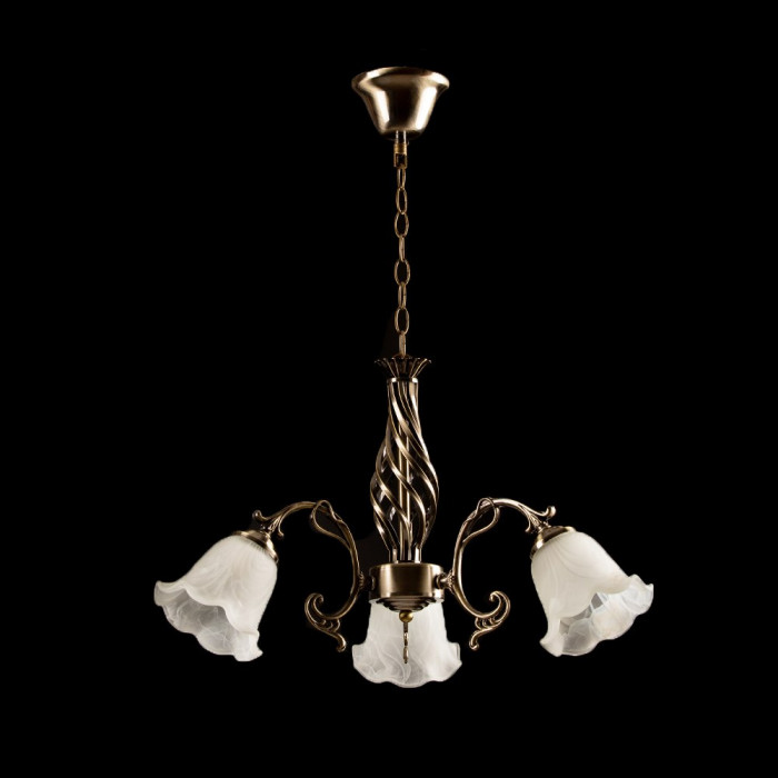 Ланцюгова люстра на три плафони з цоколем Е27 — витончене поєднання класики й декоративності. Бронзовий металевий каркас із плавними вигинами та центральною декоративною стійкою створює елегантний силует, а скляні плафони у формі квітки м’яко розсіюють світло. Габарити 55×33 см і підвіс на ланцюгу дозволяють розмістити люстру в просторих кімнатах із високими стелями.