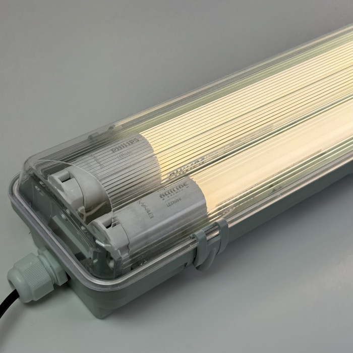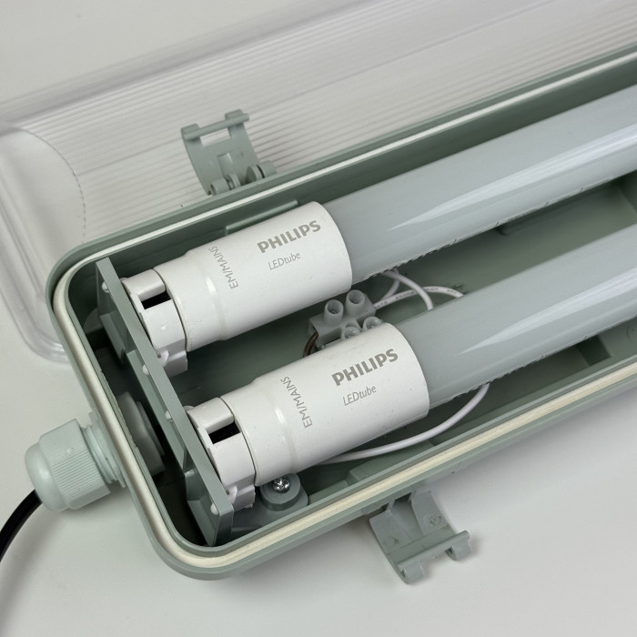 До складу комплекту входять 2товари: st-02463 (ЛПП світильник IP65 під 2 LED лампи Т8 1,2м з одностороннім підключенням) та st-03357 (ПРОФЕСІЙНА лампа Т8 Philips Core Pro LEDtube 1200mm 16W 840 C G 4000К нейтральний білий) по якій у нас найкраща цінова пропозиція В СВІТІ !!!