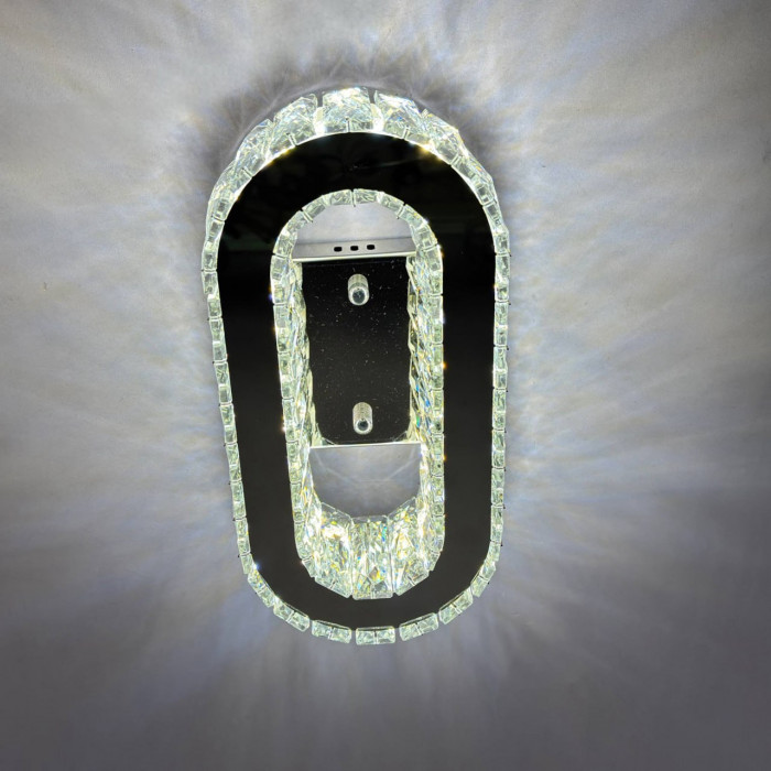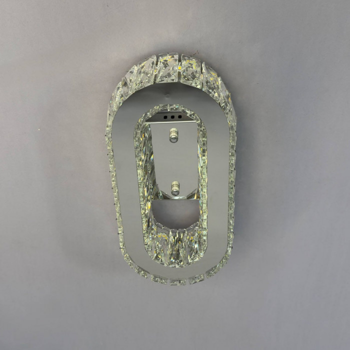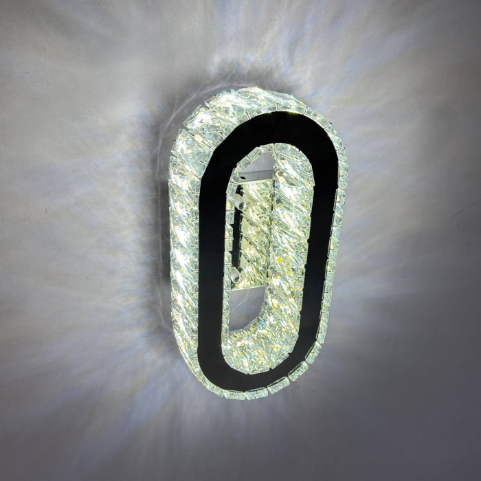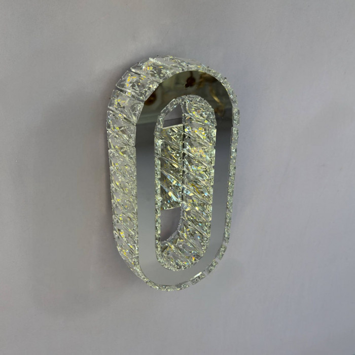 Сучасний настінно-стельовий світильник у хромовому виконанні поєднує міцний металевий корпус, прозоре скло та кришталеві елементи, створюючи елегантну гру світла й відблисків. Компактний дизайн (15×30 см) дозволяє встановлювати його як на стелю, так і на стіну, підлаштовуючи під будь-яке приміщення.
