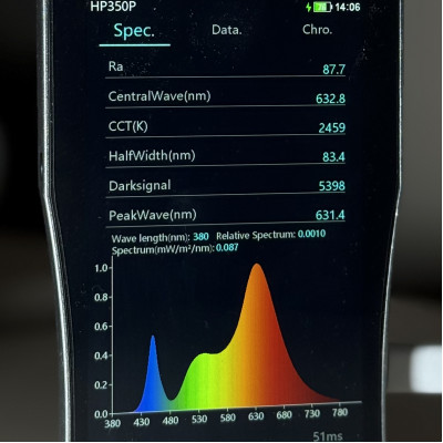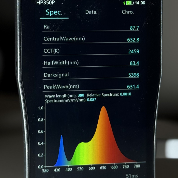 Фітолампа має низький рівень мерехтіння відповідно до стандартів ЄС 2019-2020 (SVM ≤ 0,4 / PstLM ≤ 1), що забезпечує комфортне освітлення без пульсації. Не містить ртуті та відповідає директиві RoHS, що робить її безпечним для довкілля. PPFD вимірювали на висоті 17–20 см від верхівок рослин — саме в зоні активного поглинання світла під час роботи фітолампи.