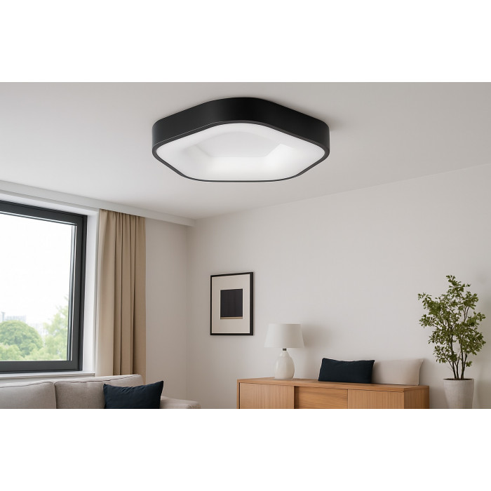 Світильник оснащений двома вбудованими LED-модулями загальною потужністю 50 W, що забезпечують яскраве та комфортне освітлення. Можливість перемикання між теплим, нейтральним і холодним світлом дозволяє легко адаптувати атмосферу приміщення під настрій або час доби. Керування здійснюється за допомогою пульта дистанційного керування.