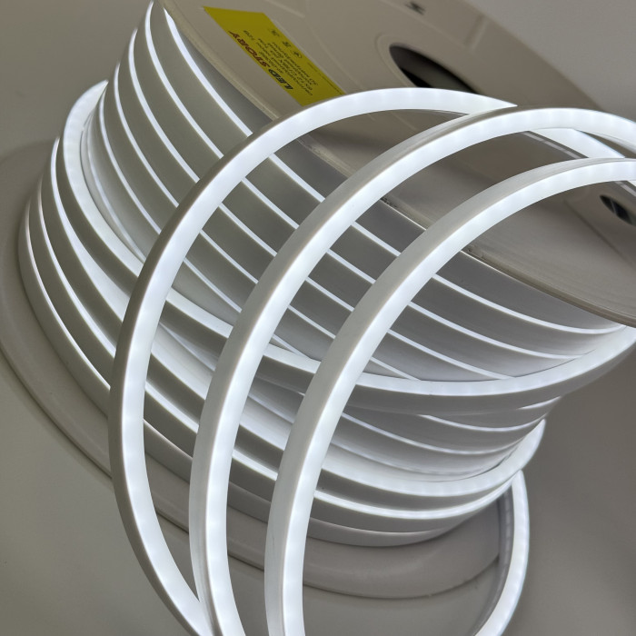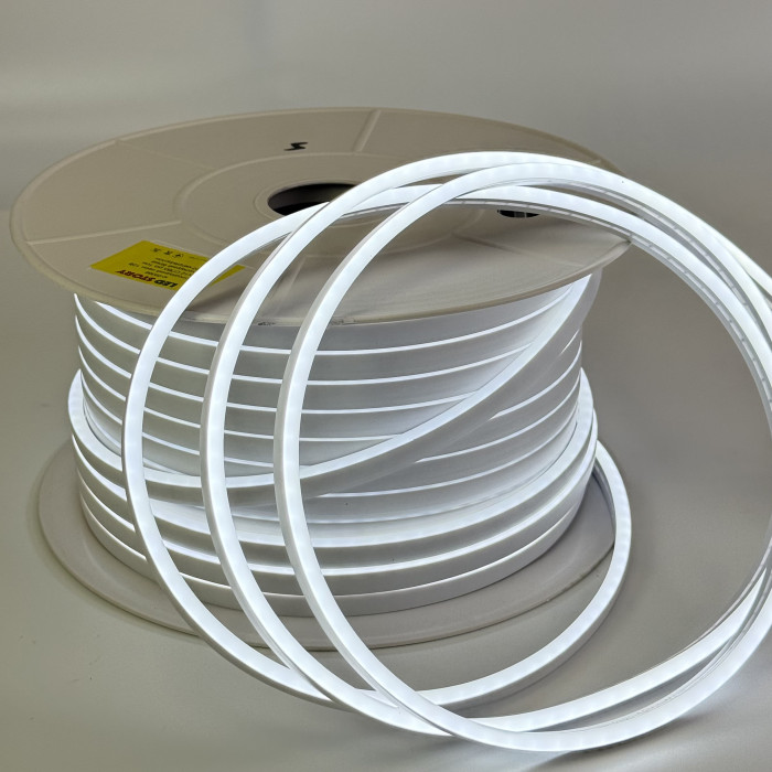 Холодний білий LED неон зі світлодіодами SMD 2835 та щільністю 120 LED/м надзвичайно гнучкий і легко приймає будь-яку форму — його можна згинати, формувати фігури, написи або контури під будь-яким кутом, встановлювати як цілісний шнур або окремі відрізки. Завдяки м’якому силіконовому корпусу з домішками ПВХ і компактному розміру 6×12 мм, стрічка органічно повторює вигини та легко інтегрується в будь-який дизайн. Світло холодного білого спектру (6500 K) з CRI 80%, потужністю 8 Вт/м і світловим потоком 20–22 лм/LED створює яскраве, чітке та комфортне для очей освітлення. Ідеально підходить для зовнішньої реклами, декоративного підсвічування меблів та вітрин, оформлення кафе, ресторанів, офісів і шоу-румів, а також для ландшафтного дизайну та світлових інсталяцій. Кожен світлодіод можна різати через 1 см, ступінь захисту IP65 гарантує надійність у будь-яких умовах, а термін служби 50 000 годин забезпечує довговічну роботу при температурах від -25 °C до +40 °C. Холодний білий LED неон — гнучкість, безпека та яскраве чисте світло для будь-яких креативних ідей.