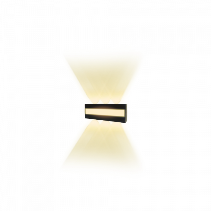 Цей світильник — не просто джерело освітлення, а елемент архітектурного ритму. Його витягнута прямокутна форма (79×168×52 мм) створює чіткий світловий малюнок: тепле світло розходиться вгору і вниз, формуючи симетричні V-подібні промені, які підкреслюють текстуру стіни та додають глибини фасаду.