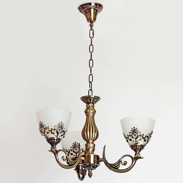 Ця люстра поєднує елегантність класичного дизайну з теплим відтінком бронзи, створюючи виразний акцент у просторі. Три скляні плафони з матовим покриттям і декоративним візерунком забезпечують м’яке, рівномірне освітлення, комфортне для щоденного використання.