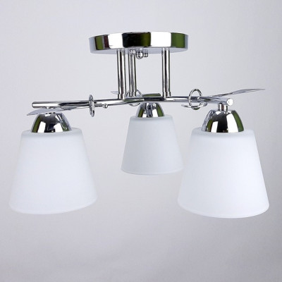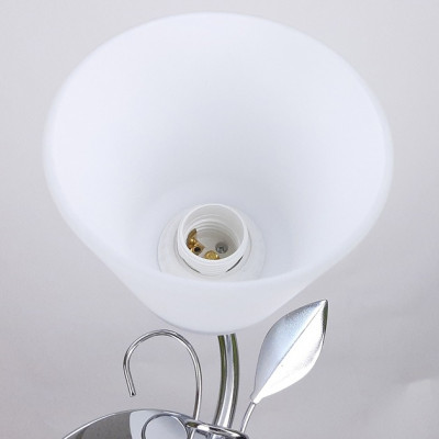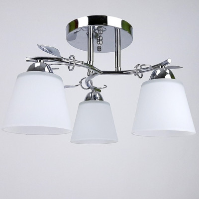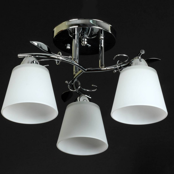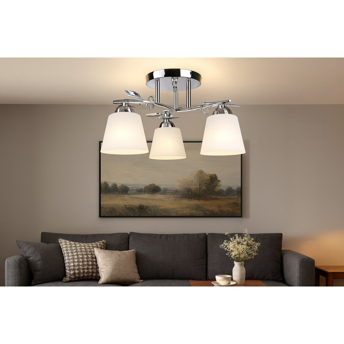 Ця стельова модель на три плафони — не просто джерело світла, а декоративний акцент, що додає інтер’єру ритму, легкості й сучасного характеру. Хромований металевий каркас із плавними лініями та декоративними елементами у формі листя створює відчуття простору, а матові скляні плафони м’яко розсіюють світло, не створюючи тіней.