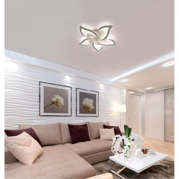 Світлодіодна стельова люстра потужністю 90W — це елегантне поєднання сучасного дизайну та функціональності. Її форма нагадує п’ятилисткову квітку, де кожна акрилова пелюстка м’яко світиться, створюючи атмосферу затишку й стилю. Білий металевий корпус гармонійно доповнює інтер’єри в стилі модерн або класика. Завдяки світловому потоку 9000 лм люстра забезпечує яскраве освітлення, а три режими світіння — теплий, нейтральний і холодний (3000–6500K) — дозволяють адаптувати атмосферу під настрій. Керування здійснюється звичайним вимикачем, що робить її зручною для щоденного використання. Надійне кріплення на планку, робоча напруга 180–265V та ступінь захисту IP20 гарантують стабільну роботу в житлових приміщеннях. Розмір 625×75 мм дозволяє люстрі виглядати ефектно, не перевантажуючи простір. Це світло, яке не просто освітлює — воно прикрашає.