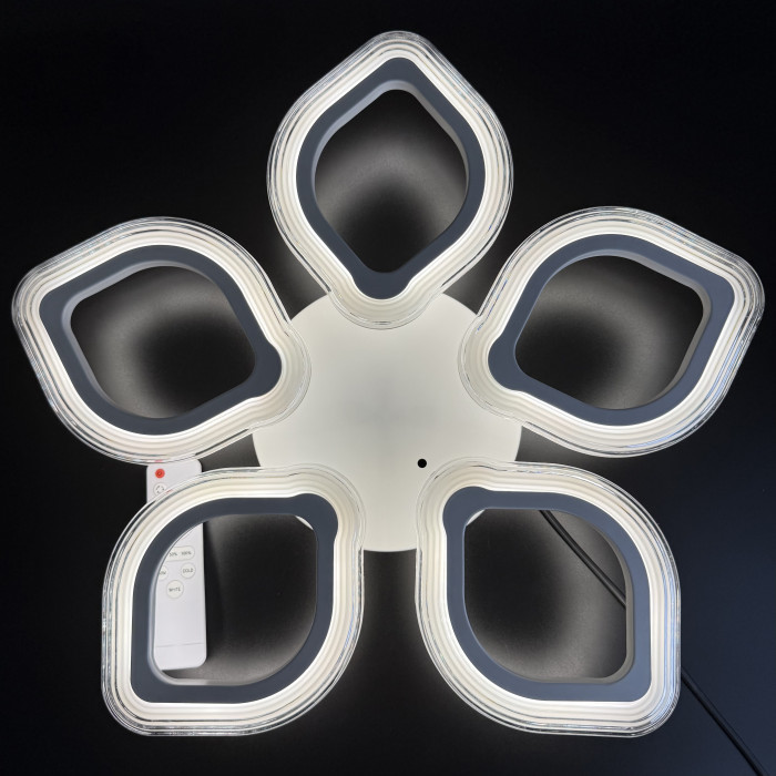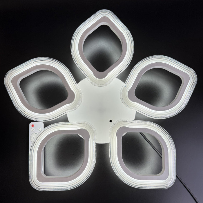 Світлодіодна стельова люстра потужністю 70W — це витончене поєднання сучасної геометрії та функціонального комфорту. 5 світлових елементів у формі листків або ромбів утворюють гармонійну симетрію, яка не просто освітлює простір, а формує його характер. Білий металевий корпус і акрилові плафони створюють легкий, повітряний образ, що пасує до інтер’єрів у стилі модерн або класика. Завдяки світловому потоку 7000 лм люстра забезпечує яскраве, рівномірне освітлення, а три режими світіння — теплий, нейтральний і холодний (3000–6500K) — дозволяють змінювати атмосферу кімнати одним натисканням пульта. Надійне кріплення на планку, робоча напруга 180–265V та ступінь захисту IP20 гарантують стабільну роботу в будь-якому житловому приміщенні. Розмір 530×75 мм робить люстру компактною, але виразною — вона не перевантажує простір, а додає йому ритму та світлової глибини.