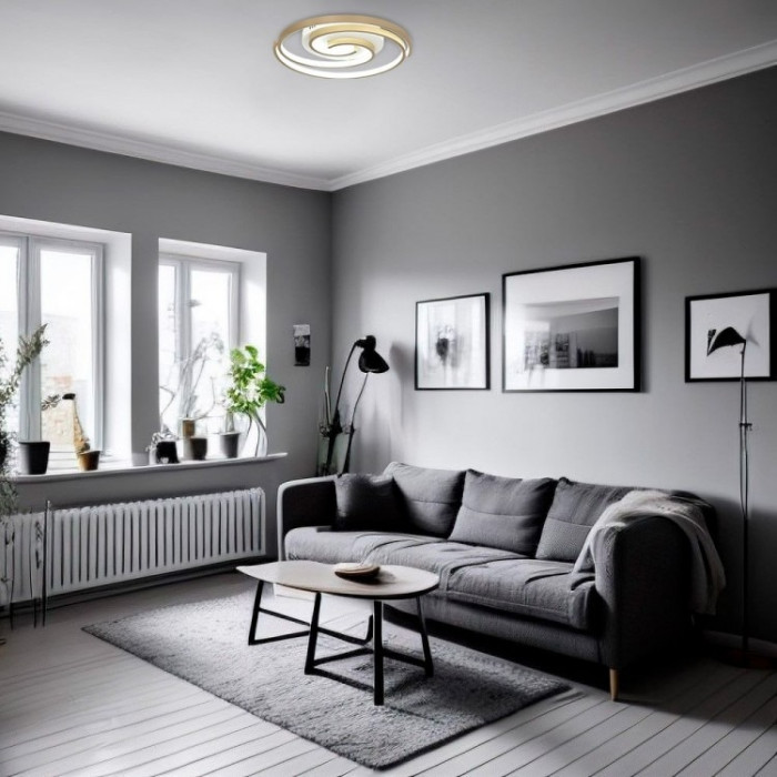 Світильник LED у золотому кольорі — це естетичне рішення для сучасного інтер’єру, де важлива не лише функція, а й візуальний акцент. Спіральна конструкція з чергуванням золотистих і білих елементів створює ефект глибини та руху, а тепле світло підкреслює елегантність форми. Потужність 75 W і світловий потік 3550 lm забезпечують комфортне освітлення для площі до 20 м². Світильник підтримує діммування, має функцію нічника та керується дистанційним пультом. Три режими кольорової температури (3000K–6000K) дозволяють змінювати атмосферу — від м’якого вечірнього світла до яскравого денного. Матеріали: метал і силікон, ступінь захисту IP20, розмір 500×420×45 мм. Ідеальний вибір для вітальні, спальні, кабінету чи зони відпочинку, де важливі стиль, комфорт і теплий золотий акцент.
