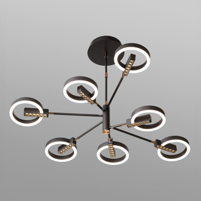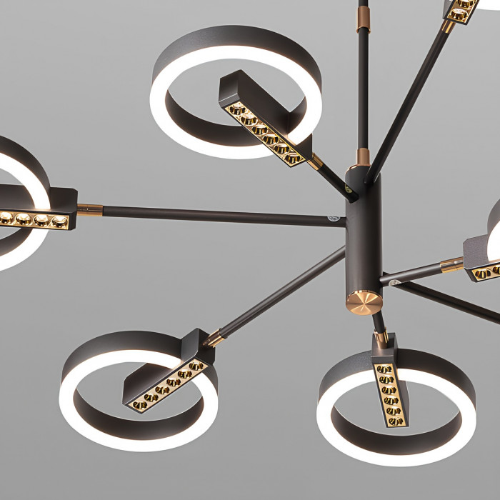 Сучасна LED-люстра у стилі хай-тек — це вдале поєднання інноваційного дизайну, енергоефективності та комфорту. Витончений металевий каркас у сірому кольорі з елегантними золотими акцентами додає інтер'єру вишуканості, а сім світлодіодних елементів у формі кілець створюють ефектний, рівномірний світловий потік. Завдяки пульту дистанційного керування ви легко зміните яскравість (димер) і колір світла — від теплого жовтого до холодного білого, що дозволяє адаптувати освітлення під будь-який настрій чи ситуацію. Діаметр 95 см та висота 57 см роблять люстру ідеальною для просторих приміщень: вітальні, спальні, студії чи офісу. Надійна конструкція з металу та акрилу забезпечує довговічність, а вбудовані LED-лампи потужністю 63 Вт гарантують економне енергоспоживання при яскравому світлі. Стильна, функціональна та зручна в керуванні — ця люстра стане справжньою окрасою сучасного інтер'єру.