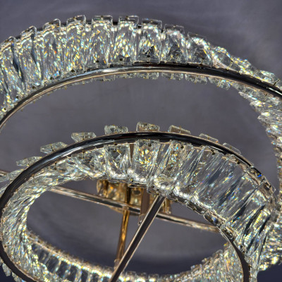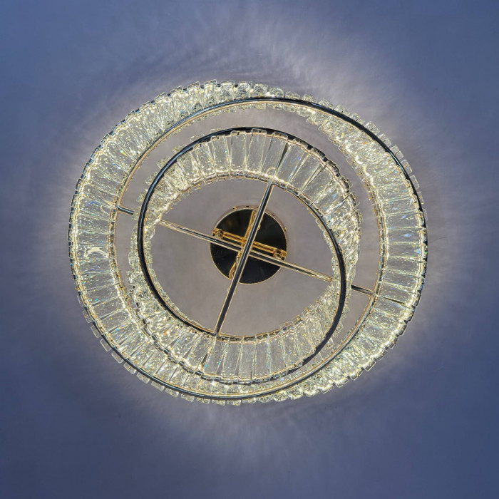 Сучасний стельовий світильник LED потужністю 110 Вт — це поєднання технологічної досконалості та естетичної розкоші. Два концентричні кільця, інкрустовані кришталевими елементами, створюють ефект іскристого світлового водоспаду, який наповнює простір теплом і глибиною. Золотиста основа та тонкі металеві опори додають конструкції витонченості, роблячи її ідеальним акцентом для інтер’єрів у стилі модерн, арт-деко чи гламур. Світильник освітлює площу 17–20 м², має розміри 60×40 см і висоту 17 см, працює від стандартної напруги 220 V та оснащений пультом керування з функцією димера для регулювання яскравості. Виготовлений із металу та кришталю, він поєднує довговічність і емоційну виразність, перетворюючи будь-яке приміщення на простір світла та стилю.