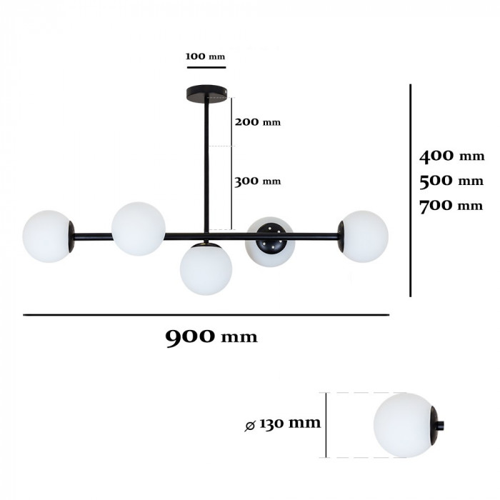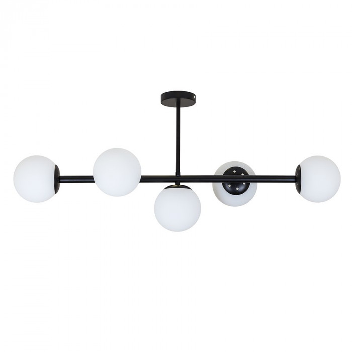 Люстра з лінійною конструкцією на п’ять плафонів — це сучасне рішення для організації освітлення витягнутих зон у приміщенні. Каркас довжиною 90 см виконаний із чорного металу та доповнений п’ятьма скляними плафонами сферичної форми діаметром 130 мм, які рівномірно розташовані вздовж осі світильника. Така конфігурація дозволяє ефективно освітлювати поверхні без перепадів яскравості та затемнених ділянок.