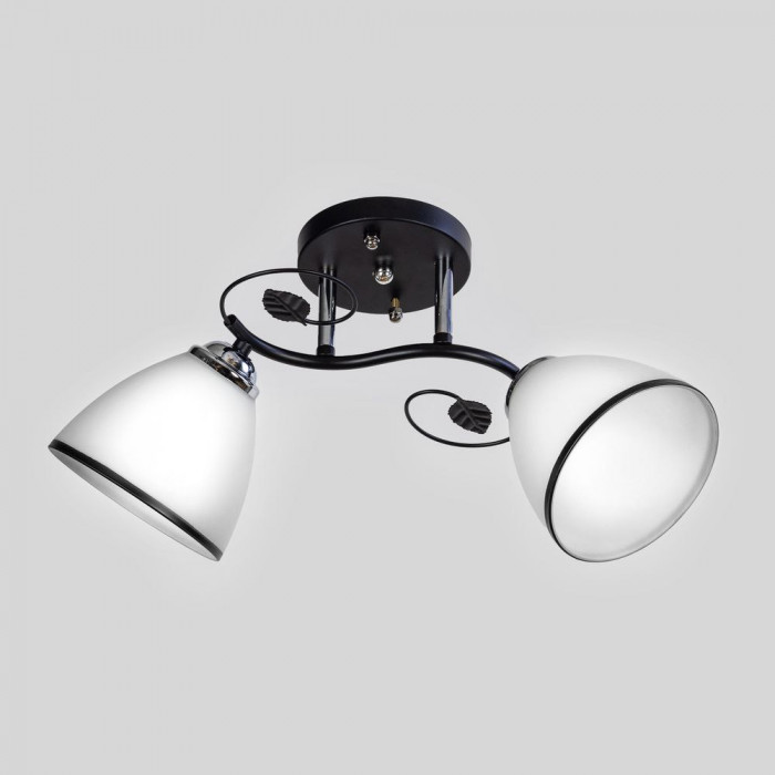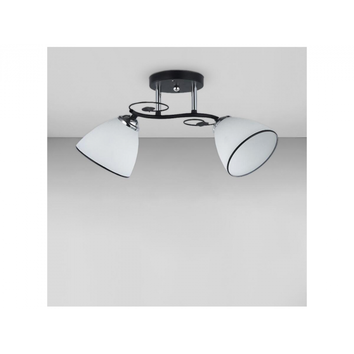 Ця компактна стельова люстра з двома скляними плафонами — універсальне рішення для освітлення невеликих кімнат. Стильний чорний металевий каркас із хромованими акцентами доповнений елегантними білими плафонами з темною облямівкою — поєднання класики та сучасного дизайну.