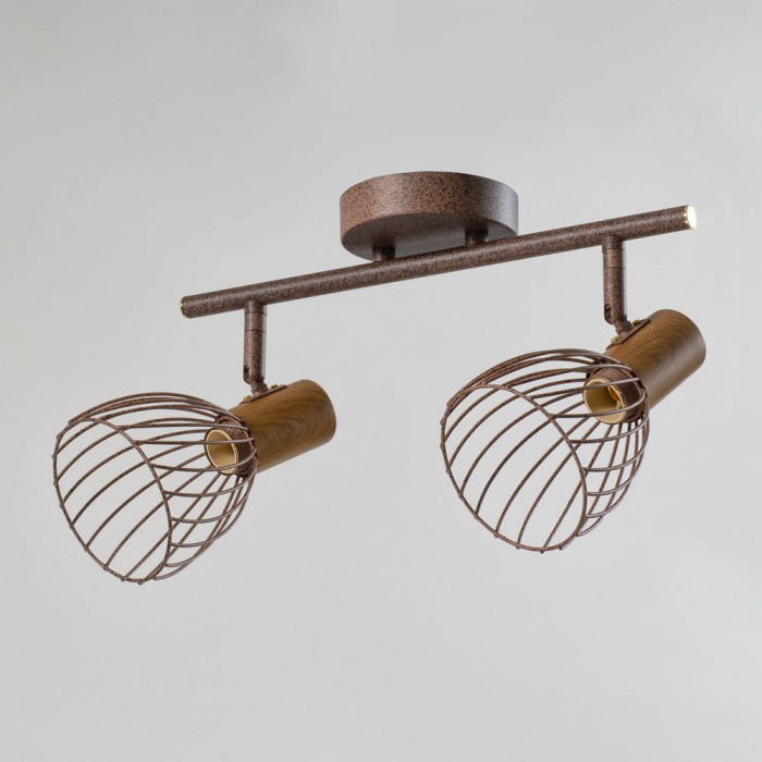 Двоплафонна стельова люстра з металевими плафонами — лаконічний акцент для сучасного інтер’єру. Модель виконана в коричневому кольорі з металевим каркасом і декоративними плафонами у формі сітчастих конусів. Завдяки мобільній конструкції плафони можна обертати, змінюючи напрямок світла відповідно до потреб — це зручно для зонального освітлення робочих поверхонь, кухонних зон або невеликих кімнат.