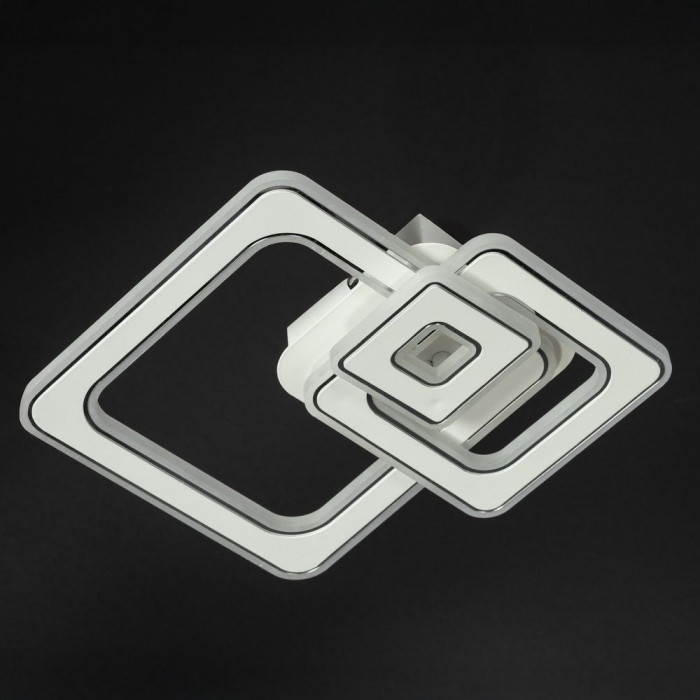 Світлодіодна люстра у стилі хай-тек вирізняється геометричним дизайном — три квадратні рамки накладаються одна на одну, утворюючи об’ємну композицію з чіткими лініями та сучасним характером. Білий металевий каркас виглядає легко й мінімалістично, а хромові вставки додають блиску та створюють ефект контрасту.