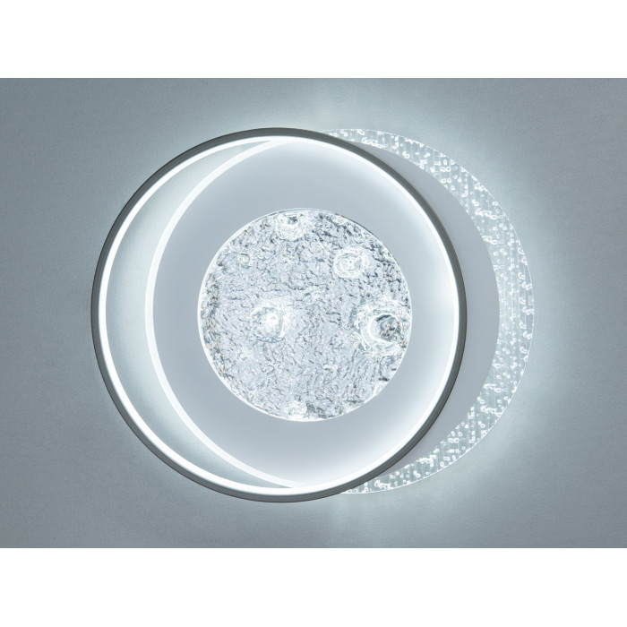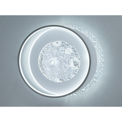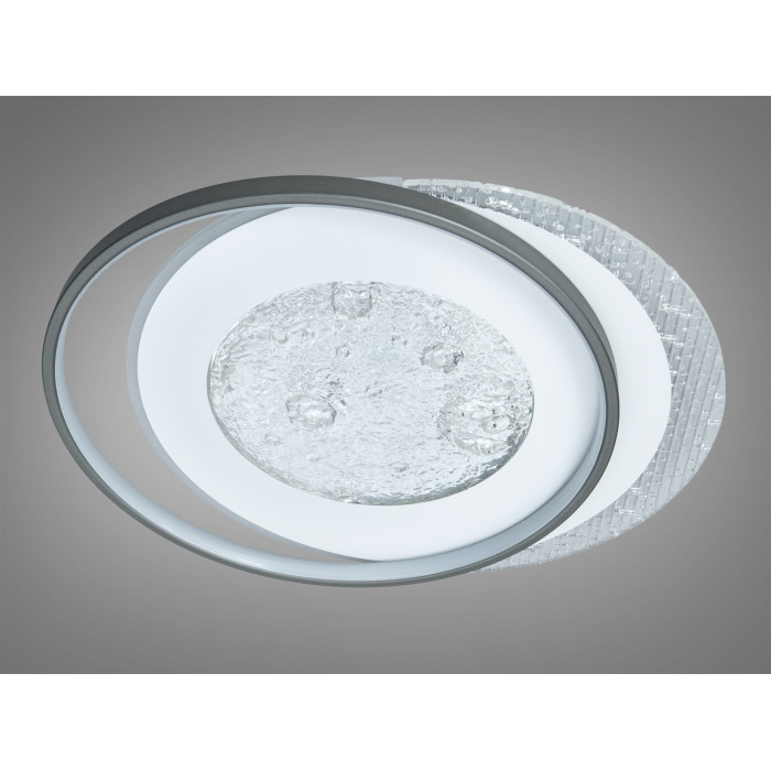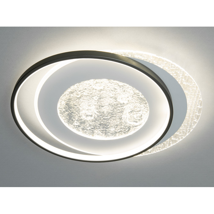 Модель вирізняється сучасним дизайном: текстуроване скло в центрі створює глибину та м’яко розсіює світло, прозорі краї додають кришталевого ефекту, а матовий плафон забезпечує рівномірне освітлення без різких тіней. Потужності 90 Вт достатньо для комфортного освітлення кімнати до 20 м², що робить люстру доречною для спальні, вітальні чи кабінету. Вбудовані LED‑елементи гарантують енергоощадність і стабільний світловий потік 4950 lm, а монтаж під стелю з тонким профілем зберігає легкість інтер’єру. Лаконічний силует і поєднання металу та скла гармонійно вписуються у сучасні та мінімалістичні простори, додаючи їм стильного акценту.