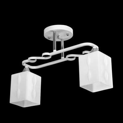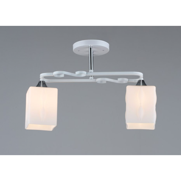 Ця стельова люстра на два плафони — ідеальне рішення для інтер’єру, де важлива чистота ліній і функціональна естетика. Білий металевий каркас виглядає стримано, але виразно, а квадратні скляні плафони з легким рельєфом додають текстури й глибини. Вони м’яко розсіюють світло, створюючи комфортну атмосферу без зайвого блиску.