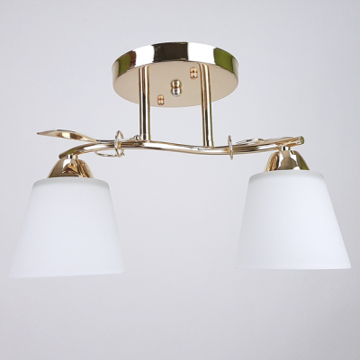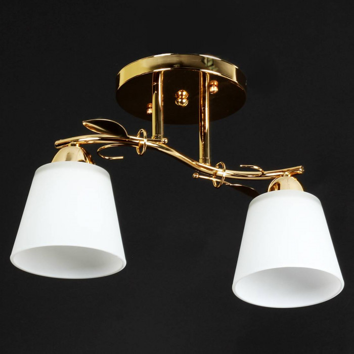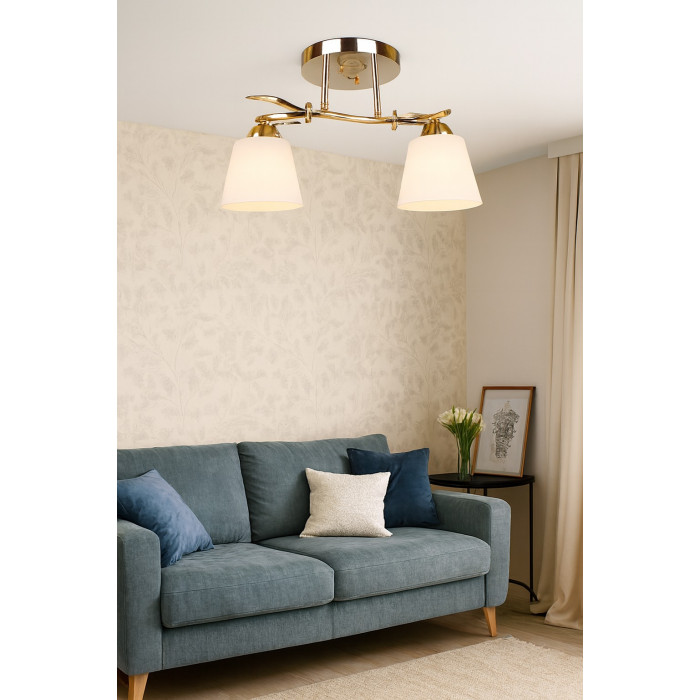 Ця стельова люстра на два плафони поєднує в собі функціональність і декоративну виразність. Її золотистий металевий каркас виконаний у формі гілочки з листям — це не просто освітлення, а справжній елемент декору, який додає інтер’єру м’якої елегантності. Матові скляні плафони м’яко розсіюють світло, створюючи затишну атмосферу без різких тіней.