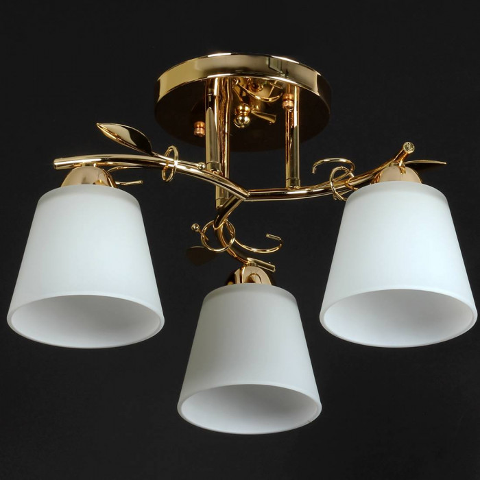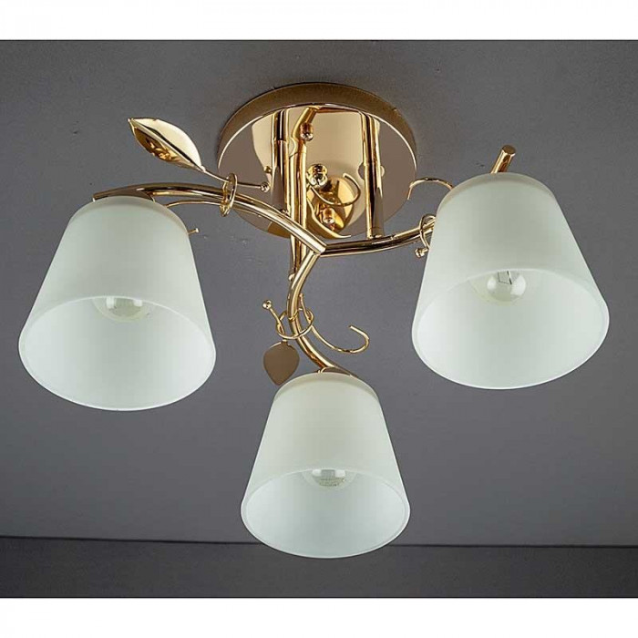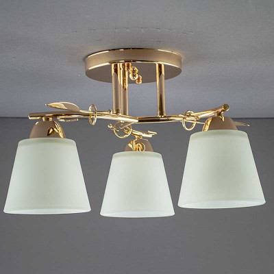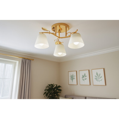 Ця стельова модель на три плафони — як витончена скульптура, що оживає при ввімкненні. Золотистий металевий каркас із декоративними вигинами та листям виглядає делікатно, але впевнено. Він додає простору тепла, а матові скляні плафони м’яко розсіюють світло, створюючи атмосферу спокою й затишку.