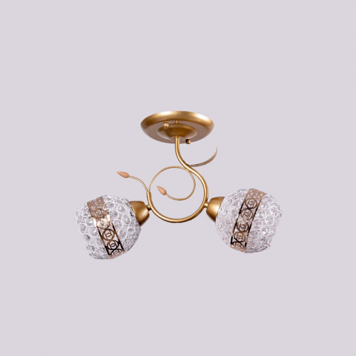 Стельова люстра з двома джерелами світла — витончене поєднання класичної декоративності та сучасної практичності. Ця модель вирізняється елегантним золотистим каркасом із плавними вигинами, що створюють м’який, органічний силует. Два сферичних плафони зі скляною текстурою нагадують бульбашки — вони не лише розсіюють світло, а й додають інтер’єру декоративної глибини. Орнаментальна стрічка на кожному плафоні підкреслює вишуканість форми, роблячи люстру помітним акцентом у кімнаті.