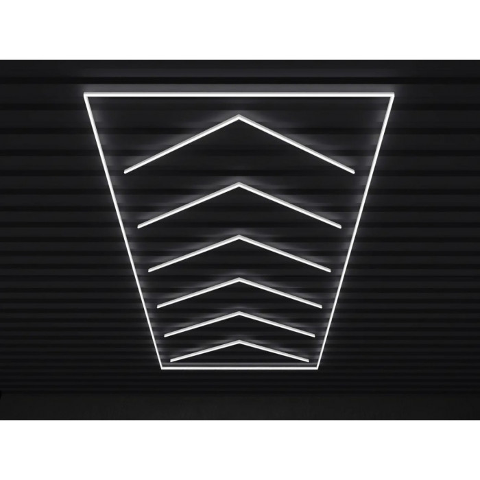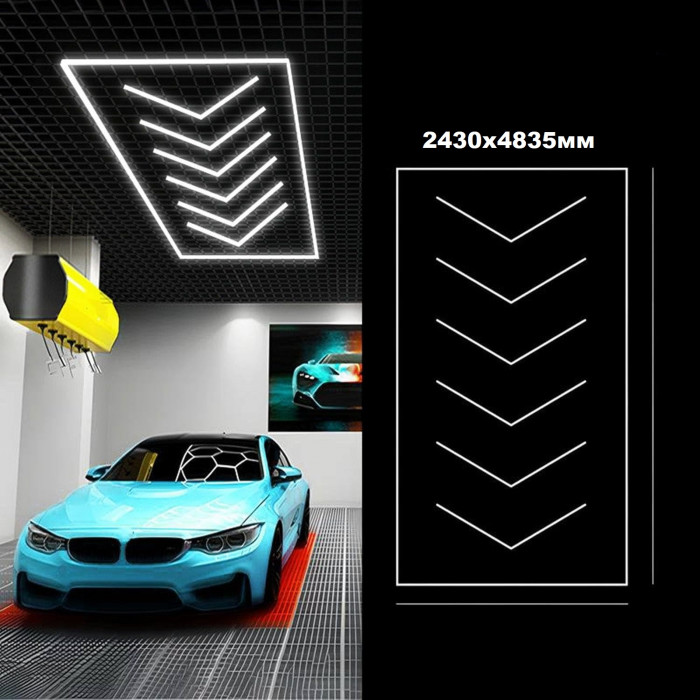 Світлодіодний світильник розміром 2430×4835 мм створений для ефективного освітлення великих комерційних просторів — детейлінг-студій, автосервісів, майстерень, спортивних залів, барбершопів та магазинів. Він забезпечує високу світлову віддачу 110–120 лм/Вт, що дозволяє якісно освітити значну площу за мінімального енергоспоживання — приблизно на рівні семи ламп розжарювання по 100 Вт, використовуючи лише одне джерело живлення.
