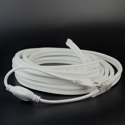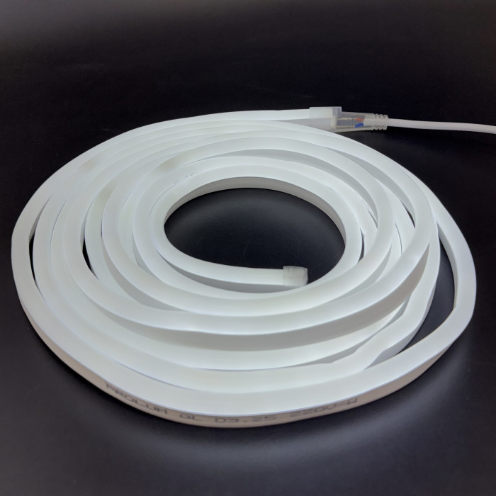 Світлодіодна неонова стрічка з холодним білим світінням (5500–6000K) працює від мережі 220В та поєднує в собі енергоефективність і високу яскравість. Завдяки 120 діодам типу SMD2835 на метр вона забезпечує рівномірне світло з кутом розсіювання 120°, а світловий потік 20–22 лм/діод створює чітке, приємне для ока освітлення. Силіконове покриття з домішками ПВХ забезпечує гнучкість, міцність і захист від зовнішніх впливів. Клас вологозахисту IP68 дозволяє використовувати стрічку навіть у складних погодних умовах — вона не боїться пилу, дощу та короткочасного занурення у воду. З потужністю 10 Вт/м та наднизьким струмом 0.044 А ця модель є надзвичайно економною, а заявлений ресурс у 50 000 годин гарантує тривалий термін служби без втрати яскравості. Ідеально підходить для оформлення інтер'єрів, фасадів, вивісок і декоративного підсвічування. Неонова стрічка постачається в комплекті з адаптером живлення та заглушкою, тому повністю готова до монтажу. Замовити її у нас можна в будь-якій кількості з доставкою до всіх міст країни.