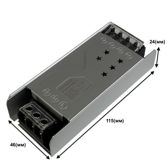 Предназначенный для внутреннего монтажа блок питания совместим со светодиодными лентами, питающимися от напряжения в 24 Вольт.