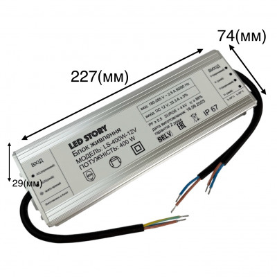Герметичный блок питания мощностью 400Вт, предназначенный для использования с ЛЕД лентами и различными низковольтными устройствами, имеющими рабочее напряжение 12В. Блок питания выполнен в металлическом корпусе с классом влагозащиты IP67. Это позволяет использовать его под открытым небом без дополнительной защиты на протяжении всего года.