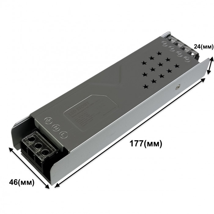 Предназначенный для внутреннего монтажа блок питания совместим со светодиодными лентами, питающимися от напряжения в 24 Вольт.