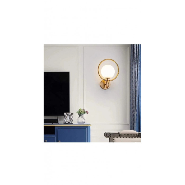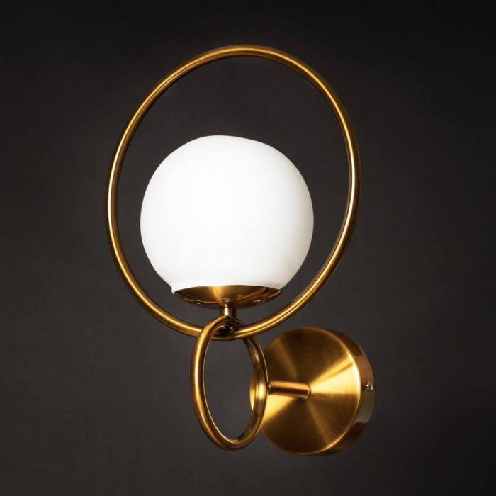 Это настенное бра – эстетический акцент, сочетающий скульптурную форму с практическим освещением. Его геометрия – изящный круг вокруг белого стеклянного плафона – создает впечатление движения и гармонии, а золотой металлический каркас придает теплу и изысканности пространства.
