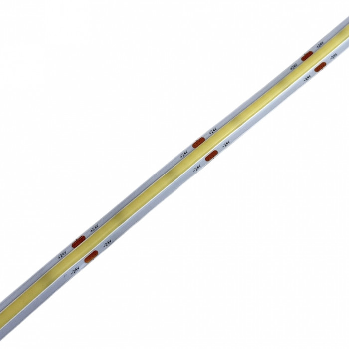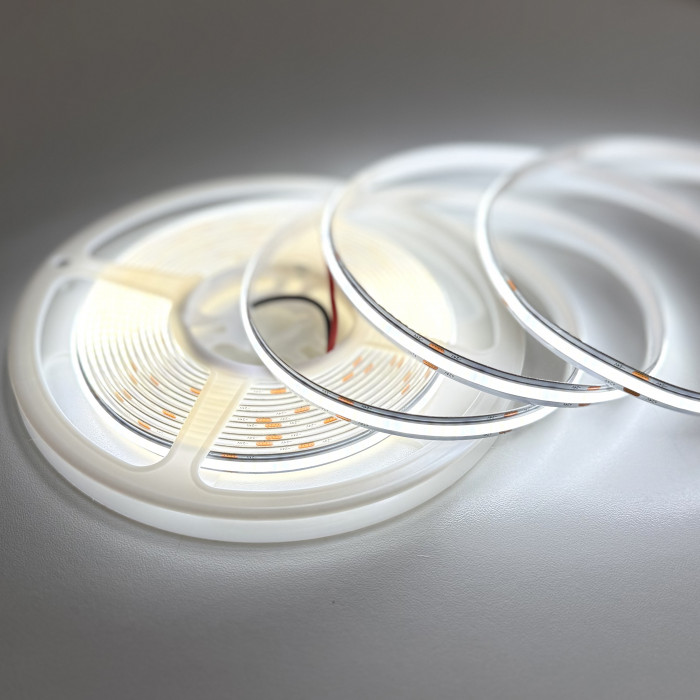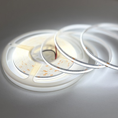 Светодиодная лента COB 320 LED/м 24V IP20 холодного белого свечения — это идеальное решение для создания ровной, яркой и безточечной подсветки. Благодаря технологии COB (Chip On Board), кристаллы размещены на плате максимально плотно и покрыты сплошным люминофорным слоем, что обеспечивает непрерывное свечения по всей длине ленты.