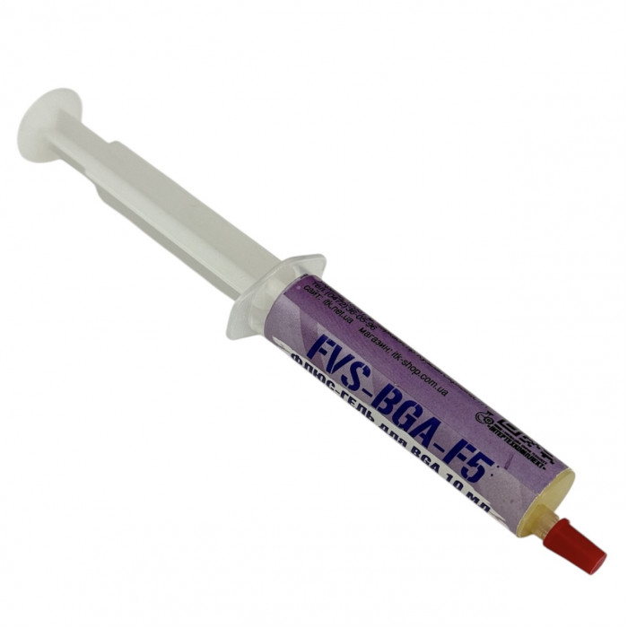 FVS-BGA-F5 - гель-флюс для пайки BGA, оплавления и обыкновенной пайки с помощью фенов и паяльников, подходит как для масляных, так и для безмасляных припоев. При 25 °C флюс имеет густую гелевую консистенцию. пленку, которую не нужно смывать для обычной пайки, но для пайки BGA рекомендуется легко и полностью смыть водой или спиртом. Флюс используется для пайки таких металлов, как медь, железо, никель, латунь и нержавеющая сталь. Рабочая температура флюса составляет 150–350°C.