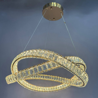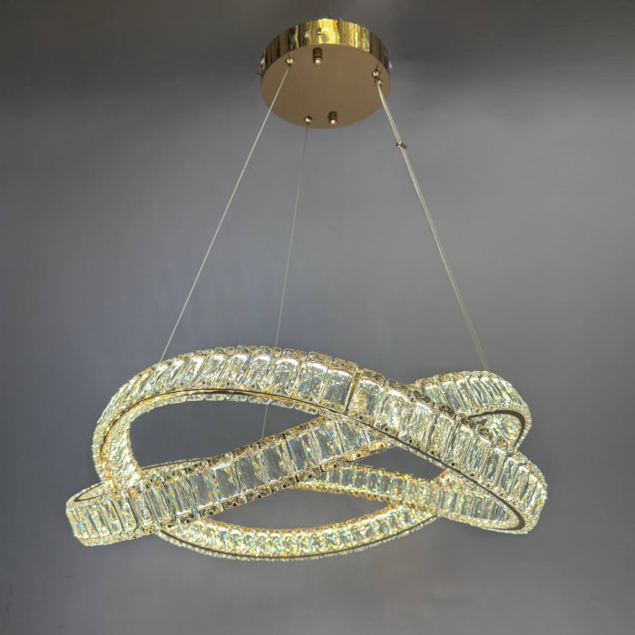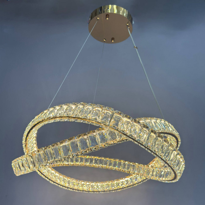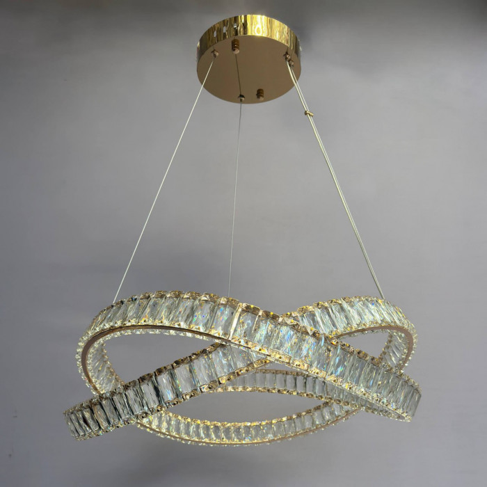 Современная подвесная люстра с изящным хрустальным оформлением – изысканное решение для освещения больших помещений площадью 17–20 м². Элегантное переплетение геометрических форм придает люстре эффектности и глубины, делая ее не только источником света, но и главным акцентом интерьера. Конструкция изготовлена из качественного металла и прозрачного хрусталя, что создает яркое и сверкающее освещение.