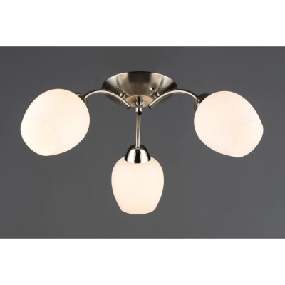 Три матовых стеклянных плафона равномерно рассеивают свет, создавая комфортную атмосферу без резких теней и ослепления. Благодаря компактной высоте люстра идеально подходит для помещений с невысокими потолками, обеспечивая достаточный уровень освещения в спальне, кухне, прихожей или гостиной.