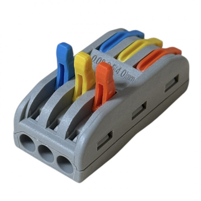 Многоразовая клемма для подключения PCT-223 с рычагами на 3 проводника проходная | типа WAGO 222 незаменима при монтаже электрических систем, предназначен для соединения одножильных проводов в распределительных коробках, распределительных щитках и т.д. Позволяет соединять как многожильные, так и одножильные проводники. Преимущество данной клеммы — возможность использования при высоких температурах, до 85°С. Клеммы быстрого монтажа позволят Вам быстро и надежно соединить провода, произвести разводку в специальных коробках и щитках, подключить осветительные приборы, а также соединить медные и алюминиевые провода (некоторые типы клемм содержат специальную пасту) не боясь окисления и коррозии.Соединительные клеммы 222-й сери имеют рычажок, опустив который провод зажимается, и подняв который провод можно достать. Благодаря такой конструкции они подходят как для одножильного так и для многожильного провода. Прозрачный корпус удобен для контроля состояния проводников. В корпусе соединителя имеются специальные отверстия для тестера.