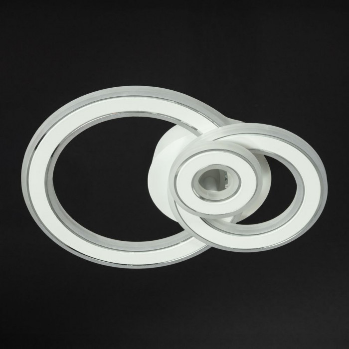 Светодиодная люстра мощностью 86Вт в стиле hi-tech отличается современным и выразительным дизайном. Три переплетенных световых кольца делают динамическую композицию, которая смотрится как арт-объект на потолке. Белый металлический каркас с хромовой вставкой добавляет контрастность и блеск, а акриловые элементы обеспечивают мягкое и равномерное рассеяние света.