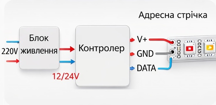 Блок питания дает напряжение. Лента светится. А контролер стоит между ними и "решает", какой сигнал пойдет на диоды. Без контроллера RGB-лента будет светить только одним цветом или вообще не будет работать корректно. А адресная лента без него – это просто набор диодов без логики.